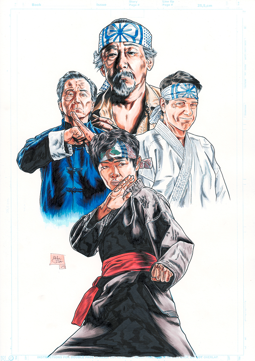 Como Yen San, en mi caso, cuando probé la distribución de los personajes, busqué que la ilustración no solo los mostrara, sino que representara la transferencia del legado, de Miyagi a Daniel, y de Daniel a la nueva generación (Li Fong y Sr. Han). Esta ilustración es una pieza para coleccionistas que valoran la complejidad de la composición y el arte de alta gama a color.
